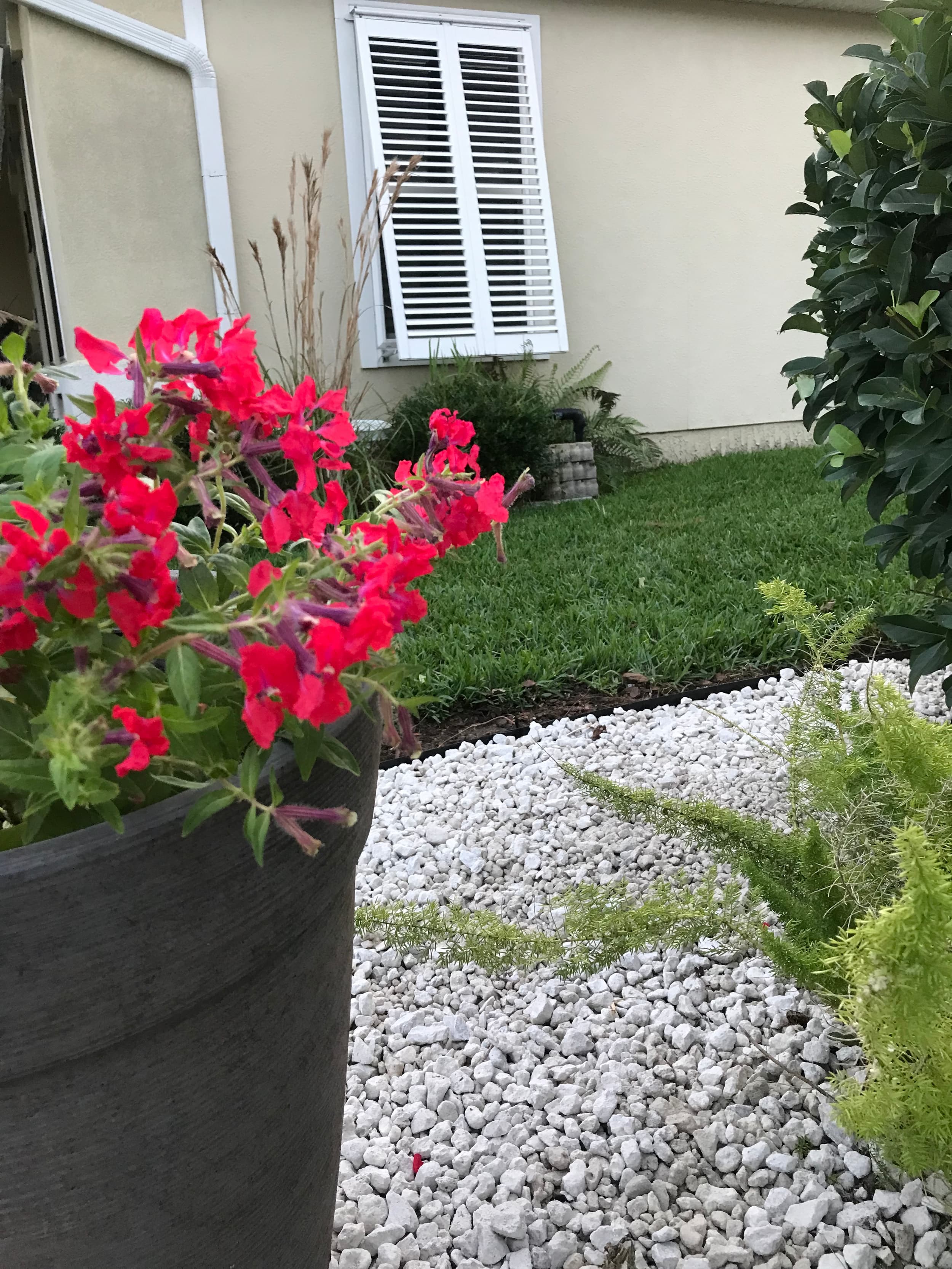 Landscape fabric paper was installed and the garden beds were filled with white rocks.